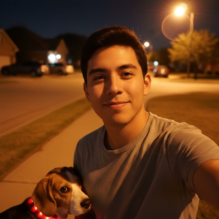 Bekijk hoe onze LED-halsbanden oplichten in het donker en honden van ver zichtbaar houden. Van speelse wandelingen in het park tot regenachtige avondrondjes — deze halsbanden blijven helder schijnen en stevig zitten bij elk avontuur.